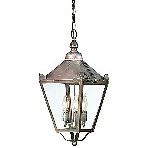 #A handsome example of early American design, the Troy Lighting Preston Outdoor Pendant boasts a simple design in solid copper and glass, creating a natural, almost antique look perfect for greeting guests at the door. Fan-like accents, two choices of finish, glass and size make this outdoor lantern as versatile as it is attractive. Troy Lighting, headquartered in California, designs and manufactures indoor and outdoor lighting fixtures, utilizing hand-forged iron and hand-applied finishes to create