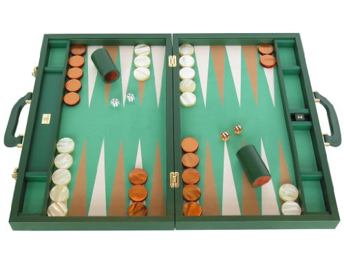 Leather Backgammon Set - Microfiber Playing Surface 23" From one of the premiere design houses in Italy, GammonVillage is proud to present the Zaza & Sacci series of luxury backgammon boards. This gorgeous green leather backgammon board is the perfect embodiment of high quality materials and superior craftsmanship you can expect in every Zaza & Sacci product. Finished in the highest quality Dollaro leather and with a plush microfiber playing surface, you'll know immediately that you are in the big leagues now. In every Zaza & Sacci backgammon game, you can expect superior finish and construction. Notice the stunning double-grip leather handle, the 24kt Gold plated locks and hinges, and the exquisitely constructed leather dice cups. What would such a quality backgammon board be without tournament sanctioned precision dice to top it all off? Every Zaza & Sacci backgammon board comes with precision dice, so you'll be 100% ready for backgammon tournament action. Additional Details Closed Case: Length: 23", Width: 14 1/4", Height: 3 3/4"; Open Case: Length: 23", Width: 28 1/2", Height: 1 7/8"; Exterior: Leather; Playing Surface: Microfiber; Clasp Style: 24kt Gold Plated with Combination Lock; High Gloss Mother of Pearl Ivory and Amber Stones; 2 Leather Cups - Green Color; 2 Sets of Opaque White and Golden Amber Dices, and a Black Cube.
