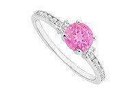 #This timeless engagement ring with brilliant-cut round pink sapphire prong-set in the center and is complimented by two round diamonds and other smaller diamonds are channel-set on sides. Made in 14K white gold & has a total weight (TGW) of 0.50 carat and also available matching wedding band model no. W3021BW14D.